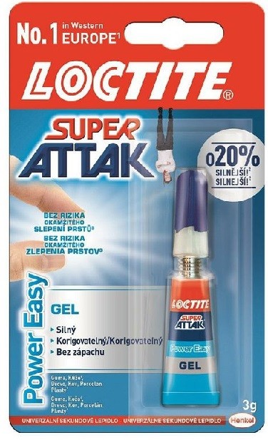 Loctite Super Attak Power Easy 3g, sekundové lepidlo. Vhodné na lepenie porcelánu, keramiky, plastov, gumy, kože, dreva a kovov. Nevhodné na lepenie PP, PE, polystyrénu a jemnej kože.Vyznačuje sa vysokou pevnosťou na pevných a hladkých plochách.Bezpečný uzáver proti vytečeniu a zaschnutiu lepidla.Jedna kvapka stačí. Lepené predmety k sebe pritlačte a držte až do zaschnutia.Po použití aplikačnú trysku utrite handričkou a dôkladne uzavrite.Uložte do zvislej polohy na chladné a suché miesto.Špendlíkový uzáver zabraňuje zaschnutiu lepidla v aplikačnom hrote.